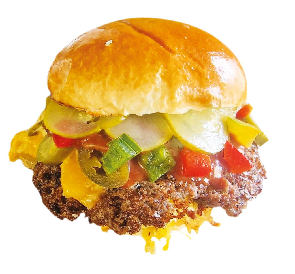 1x BEEF-PATTY, EISBERGSALAT, KÄSE, KARAMELLISIERTE ZWIEBEL, SAURE GURKE, JALAPENOS, SENF SOßE